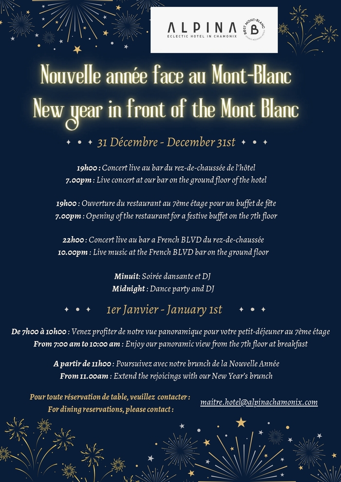 Pour toute réservation de table, veuillez contacter : maitre.hotel@alpinachamonix.com
